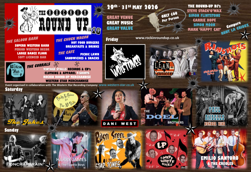 Dani West, The Wolftones, Ponchartrain, from the USA Lean Canteen and once again after many years LP & His Dirty White Bucks. This year the Round-Up welcomes newcomers The Jukes and great young talent Harry James.